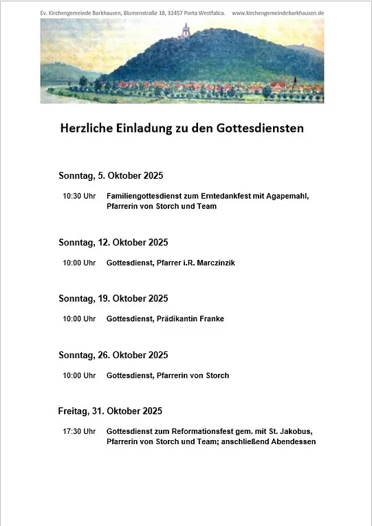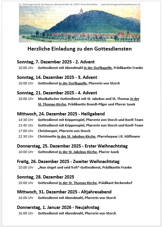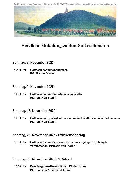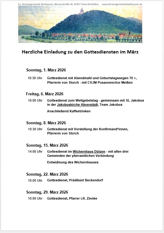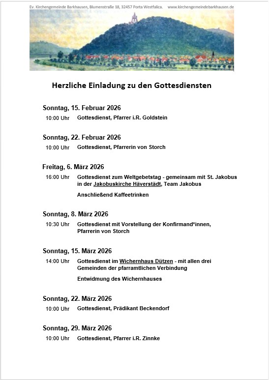 In der Regel finden die Gottesdienste in der Kirche in Barkhausen statt (Abweichungen sind angegeben).
